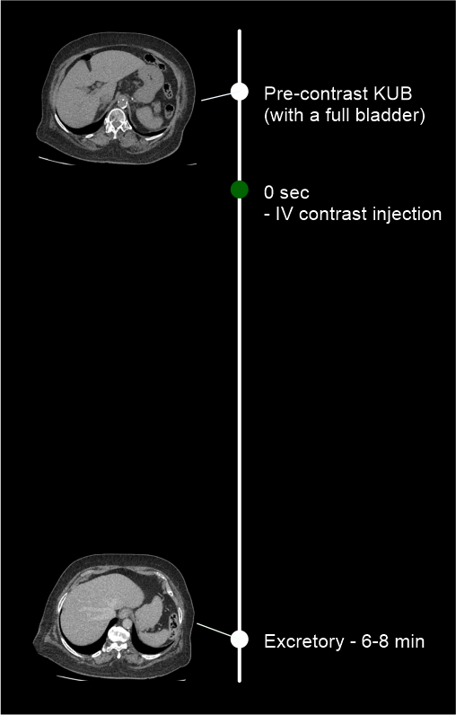 - Plan both pre-contrast and excretory phases to cover from dome of the diaphragm to a level just below the ischial tuberosities.