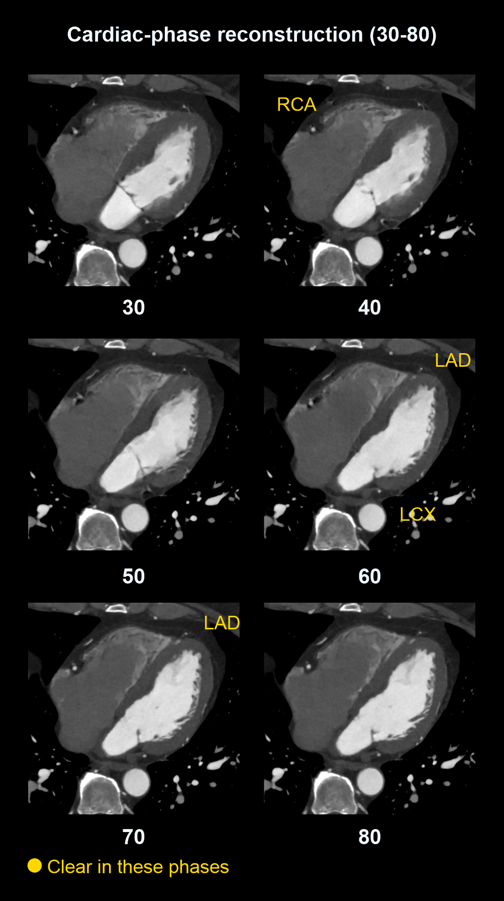 For retrospective and wide prospective acquisitions (30-80%), images should be reconstructed at various phases of cardiac cycle. Usually, a 10% gap is kept between each phase separation. For instance, images are reconstructed as 0, 10, 20, 30, 40, 50, 60, 70, 80, 90 and 100 for a retrospective (100%) acquisition.