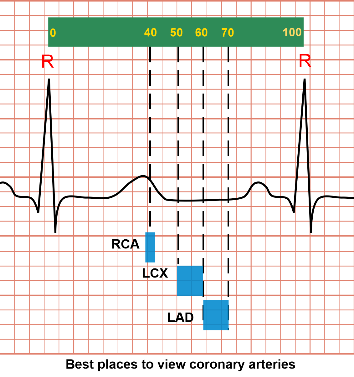 - Left anterior descending (LAD) – 60 to 70% in window