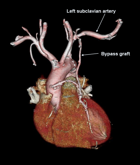 Explanation: to include bypass graftsfrom the subclavian artery to heart, and helical scan is used to cover a wide area.