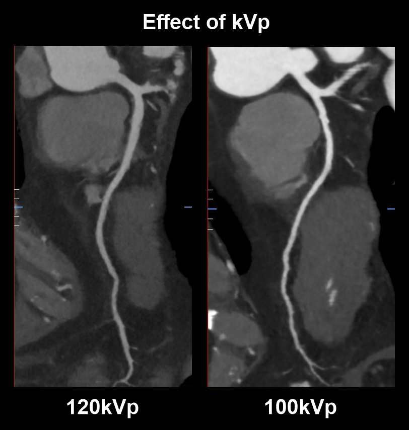 As in the diagram, scan with lower tube voltage (100kVp) has higher vascularcontrast than the scan with higher tube voltage (120kVp).