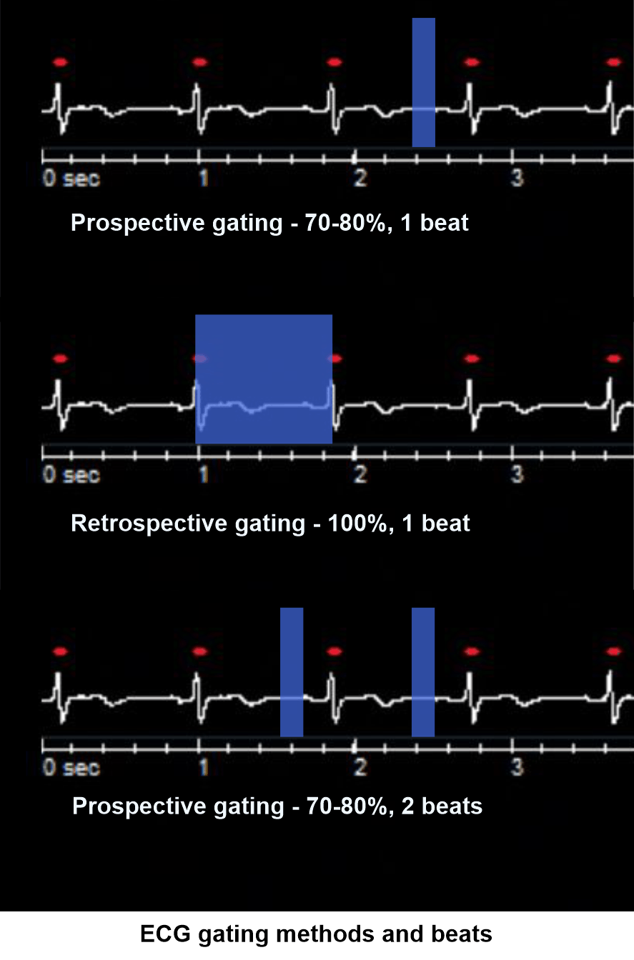 There are two major cardiac gating techniques known as prospective and retrospective. In prospective gating, a particular part of the cardiac cycle is acquired (70 to 80). In retrospective gating, whole cardiac cycle is continuously acquired (0 to 100). Comparatively, prospective gating is better as it provides lower radiation to the patient. However, for the functional analysis, whole cardiac cycle is acquired using retrospective gating.