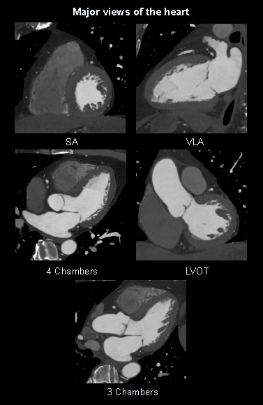 - 2D views of the heart or multiplanar reformations (MPRs): four chambers, three chambers, left ventricular outflow track (LVOT), short axis (SA) and vertical long axis (VLA).