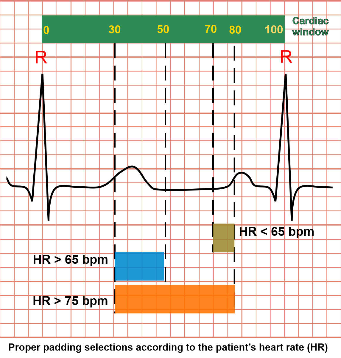 The cardiac window is like a ruler that has numbers starting from 0 to 100, and these two ends (0 and 100) are corresponding with two-adjacent-R points (ECG). So, we’re able to select specific parts of cardiac cycle, using these numerical values. For instance, Range 70 to 80 in cardiac window represents end-diastole, and this range selection is called padding.
