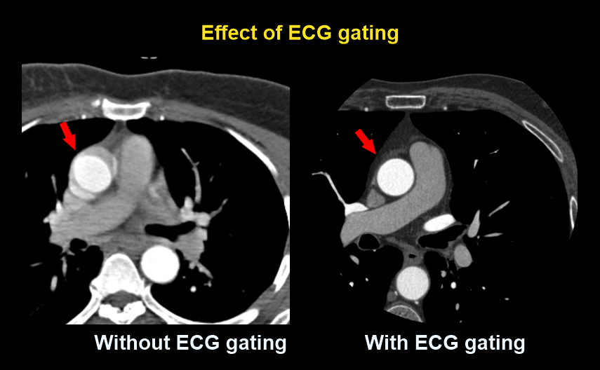 Explanation: ECG leads has metallic components that provide metallic artifacts. However, ECG gating helps to avoid aortic root motion artifacts.