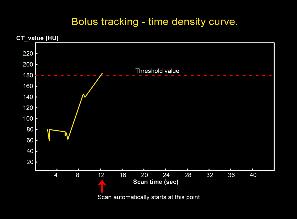 In this method, ROI monitors live HU (Hounsfield units) value of descending aorta. As shown in the diagram, scan automatically starts when the monitoring HU value reaches the pre-planned threshold HU value.