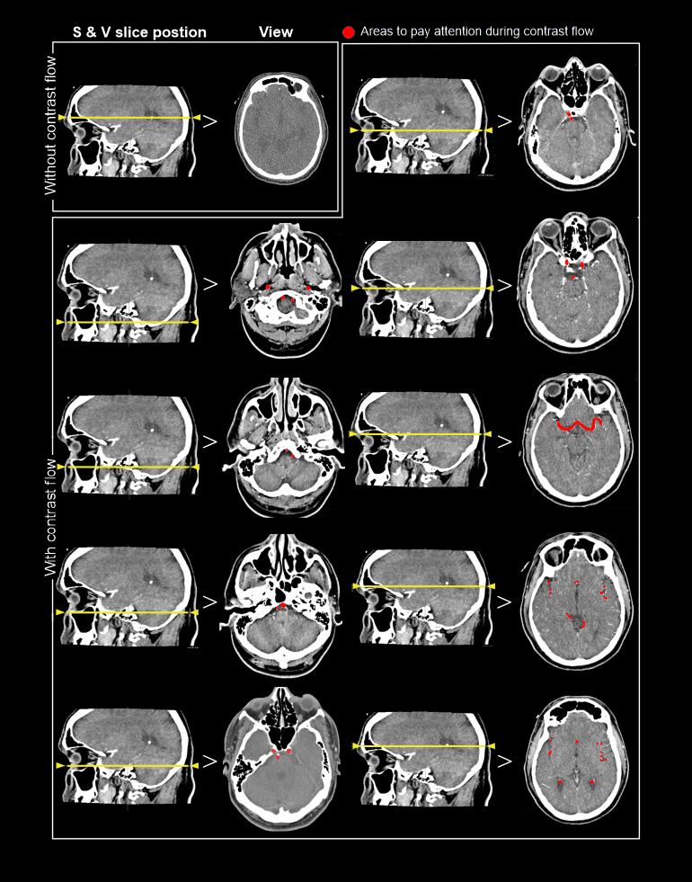 - Manual start is used to initiate the scan because it is quite challenging to find cerebral arteries in the S & V (pre-contrast) and also to place a small region of interest (ROI).