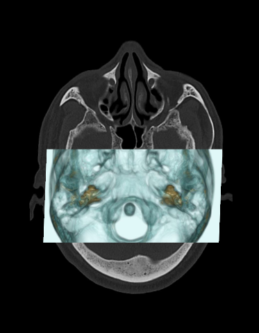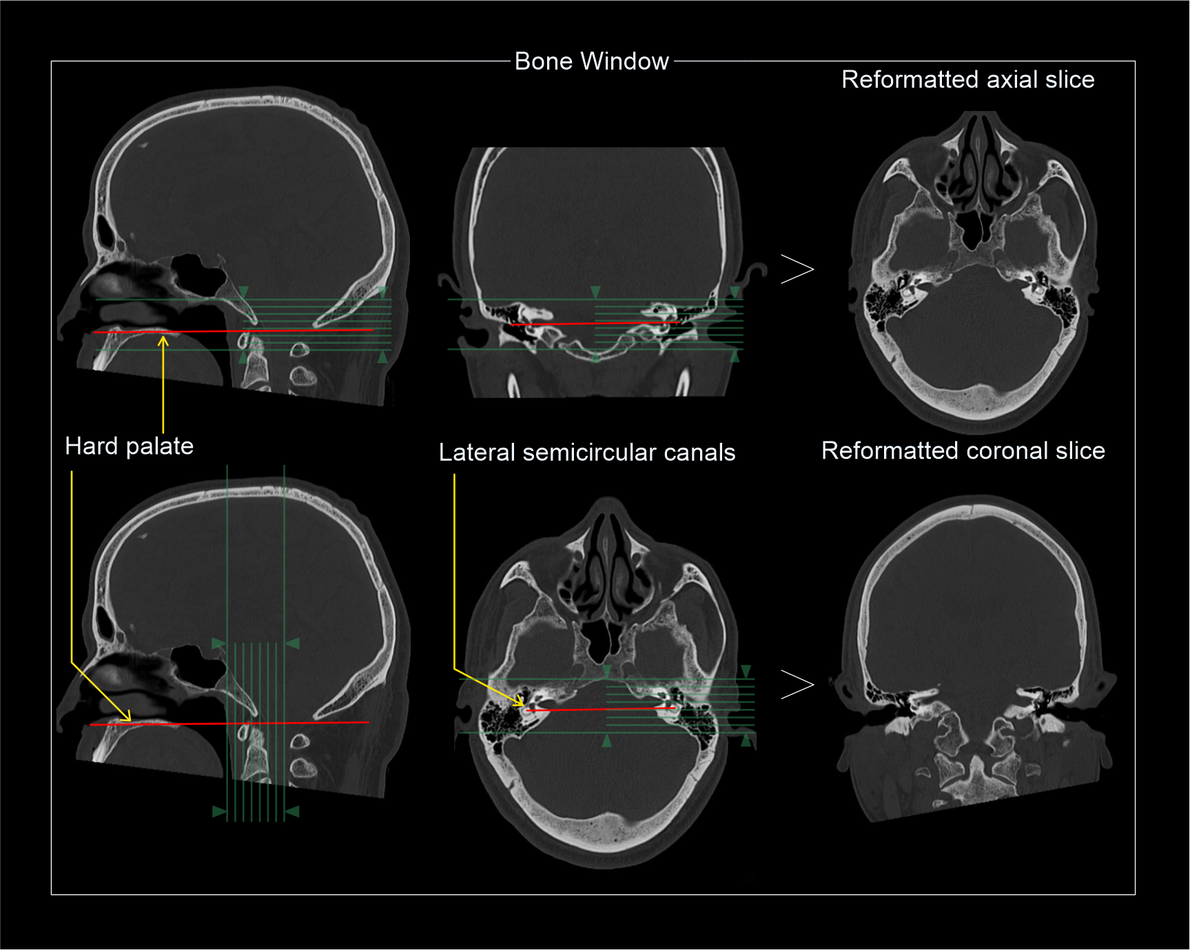 - Maximum slice thickness of 1mm in axial and coronal planes, reconstructed in bone window (WW:4500, WL:450) to show both canals in the same plane.