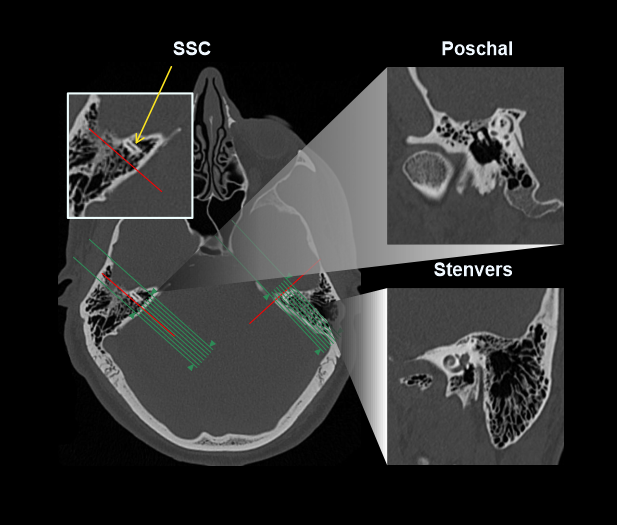 For the diagnosis of superior semicircular canal (SSC) dehiscence, which is caused due to an abnormal opening from SSC into the brain. Additional oblique images can be reformatted through SSC in short and long axis, respectively known as Poschl (Parallel to the plane of SSC) and Stenvers (Perpendicular to the plane of SCC).