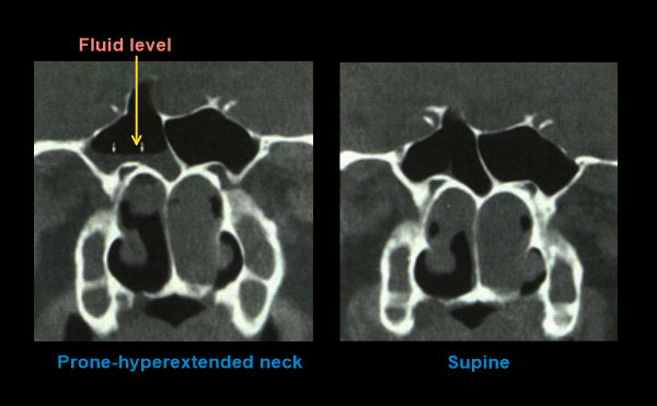 Doing the scan in both positions may necessary to differentiate lesions attached to the inner wall of the sinus because fluid levels change with the patient position, but not the attached neoplasms.