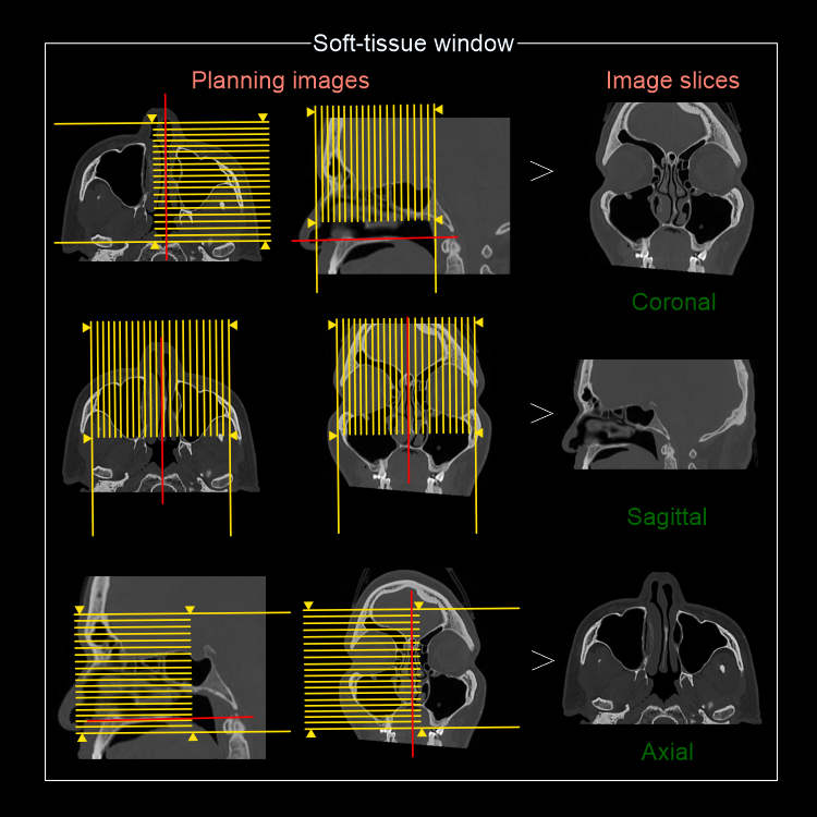 - In supine method, plan the scan slab to cover from the hard palate up to the superior border offrontal sinus.