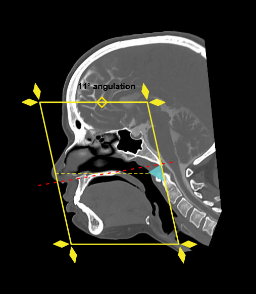 - In prone method (neck hyperextended), plan the scan slab to cover from nose to posterior margin of sphenoid sinus. Scan slab needs to be perpendicular to hard palate, which is achieved by tilting the gantry.