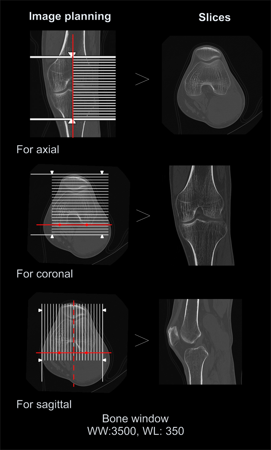 - Axial, sagittal and coronal images in both bone (WW: 3500, WL: 350) and soft tissue window (WW:500, WL:50) with ≤ 2mm slice thickness.