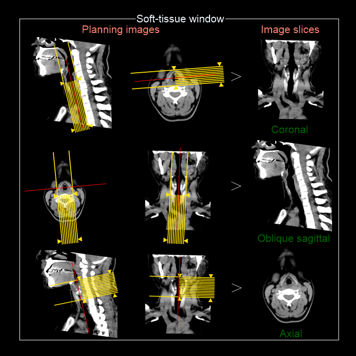 - Axial, coronal and sagittal images in soft-tissue window (WW: 400, WL:40), without exceeding 3mm slice thickness – reach our Neck contrast article for images.